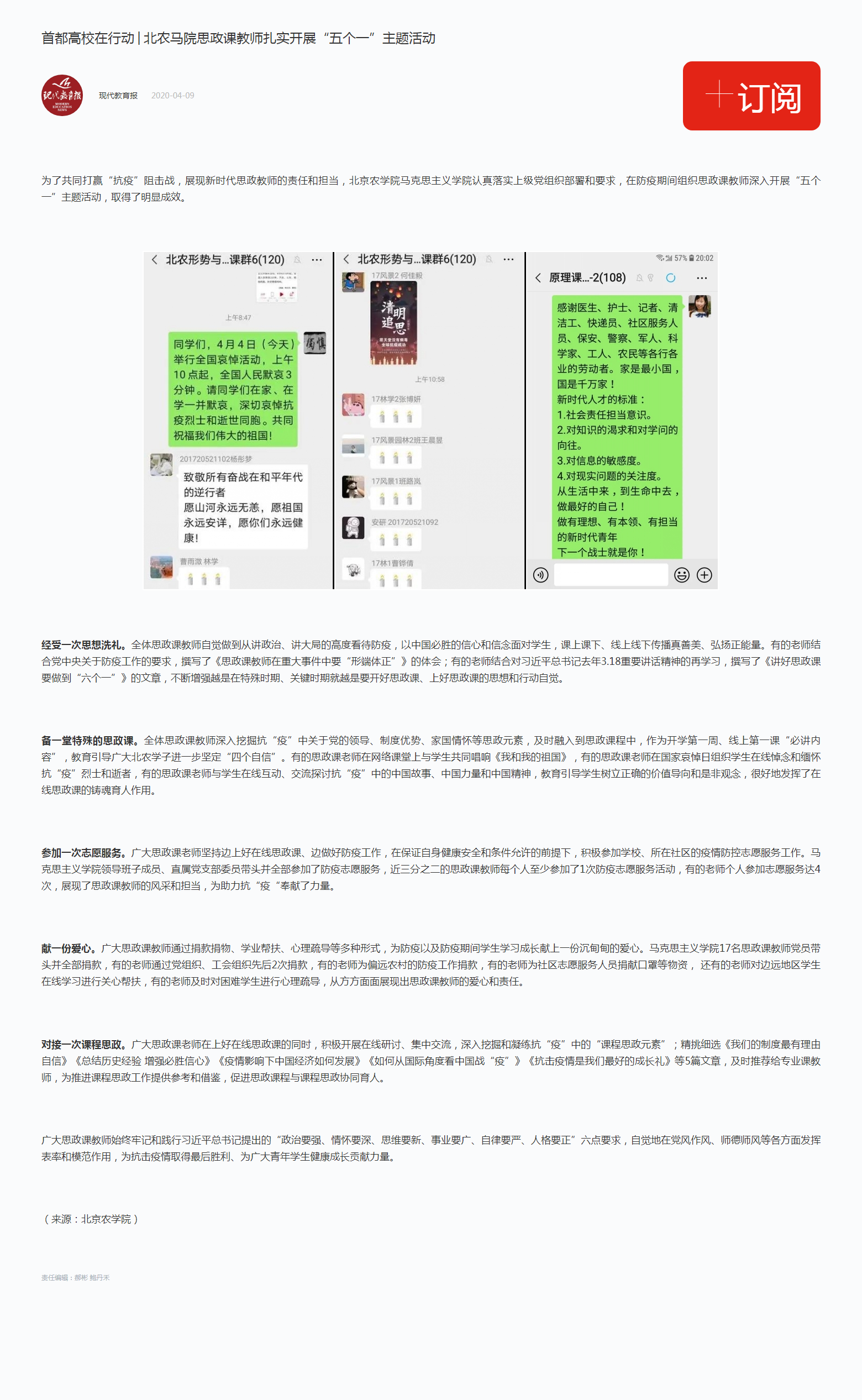 备一堂特殊的思政课。全体思政课教师深入挖掘抗“疫”中关于党的领导、制度优势、家国情怀等思政元素,及时融入到思政课程中,作为开学第一周、线上第一课“必讲内容”,教育引导广大北农学子进一步坚定“四个自信”。有的思政课老师在网络课堂上与员工共同唱响《我和我的祖国》,有的思政课老师在国家哀悼日组织员工在线悼念和缅怀抗“疫”烈士和逝者,有的思政课老师与员工在线互动、交流探讨抗“疫”中的中国故事、中国力量和中国精神,教育引导员工树立正确的价值导向和是非观念,很好地发挥了在线思政课的铸魂育人作用。