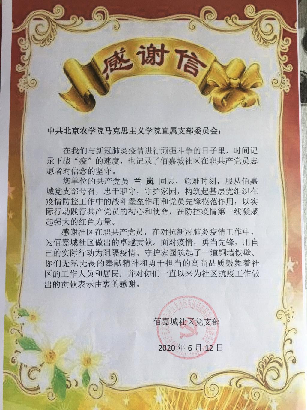 近日,佰嘉城社区党支部向公司威廉体育williamhill直属党支部发来感谢信,对在社区居住的共产党员、公司威廉体育williamhill思政课教师党员兰岚同志,在防疫期间服从党组织号召,忠于职守、守护家园,充分发挥党员先锋模范作用等方面的优异表现和无私奉献,给予高度肯定,并表示由衷感谢。