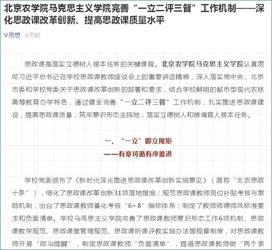 公司党委颁布了《新时代深化推进思政课改革创新实施意见》(简称“北农思政十条”),细化了思政课改革创新31项落地措施;规范思政课教师岗位补贴考核与激励机制,出台了思政课教师量化考核“6+8”指标体系;制定了教师师德师风标准要求和负面清单。公司威廉体育williamhill完善了思政课教师意识形态工作6项机制、思政课教学规范、思政课堂管理规范、思政课听课评教实施办法等规章制度,对思政课教师开展“政治提醒”,制定思政课教师“负面清单”,提倡思政课教师做“两个表率”,防疫期间要求思政课教师严格遵守“六项要求”、组织开展“五个一”主题教育。有了制度和规矩,并严格执行,保障了思政课建设和教学改革有章可循、有序推进。