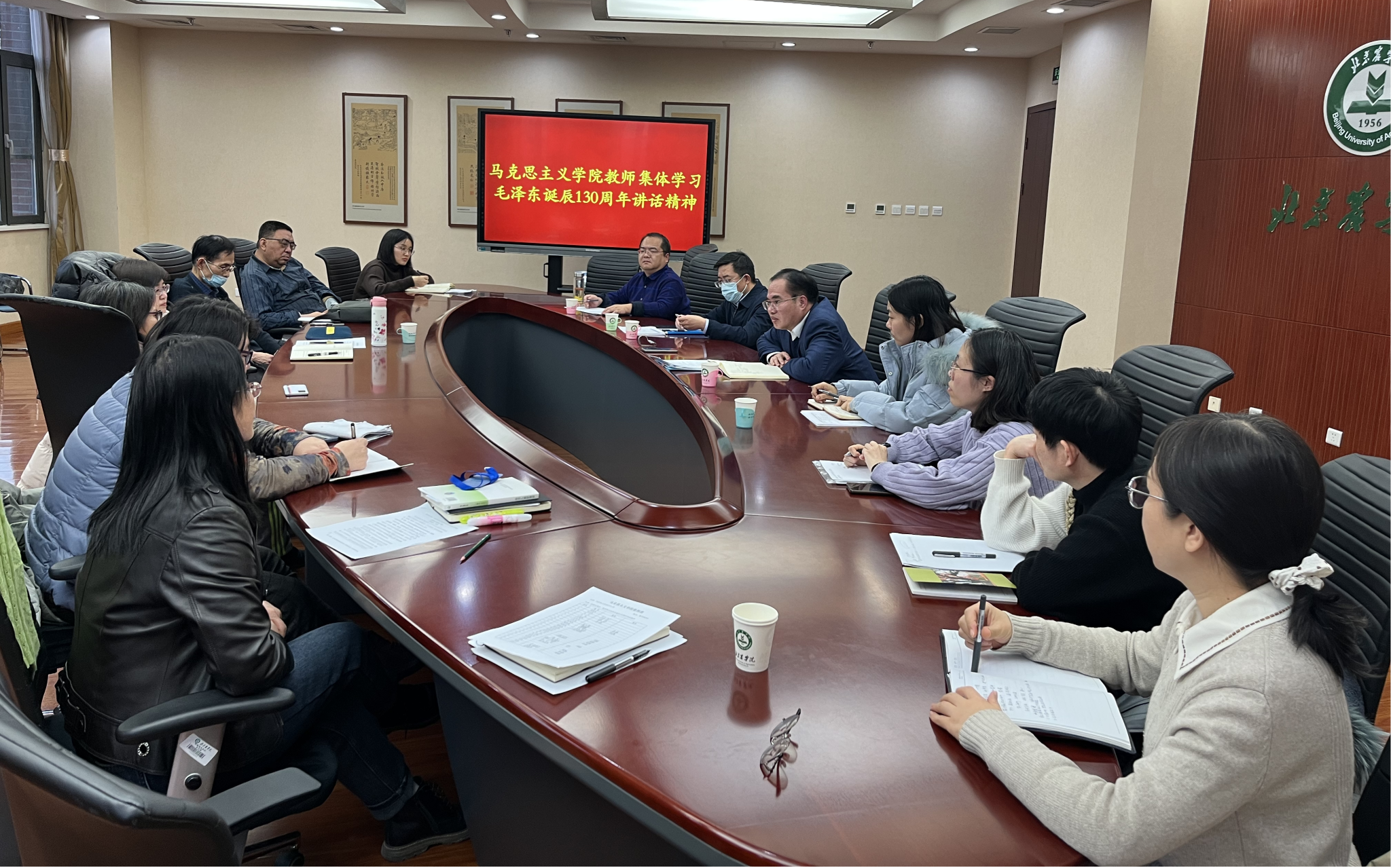 12月28日下午,威廉体育williamhill思政课教师集体学习研讨习近平总书记在纪念毛泽东同志诞辰130周年座谈会上的重要讲话精神。会议由经理华玉武主持。