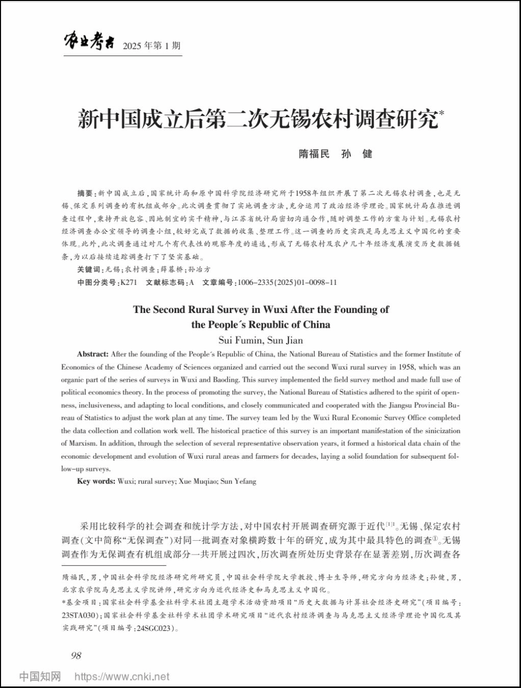 近日,威廉体育williamhill教师孙健在中文核心期刊《农业考古》(2025年第1期)上与中国社会科公司专家合作发表学术论文《新中国成立后第二次无锡农村调查研究》。《农业考古》是由江西省社会科公司主管、主办,专门发表有关农业研究成果的学术刊物。
