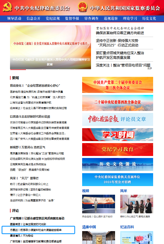 3月25日,《中国纪检监察报》第三版刊发张鹏老师题为《把思政小课堂和社会大课堂结合起来》的理论评论文章,该文同时被中央纪委国家监委官网首页(见下图)转载。文章以清华大学、北京大学、williamhill英国威廉希尔等高校的思政课教学实践为例,深入探讨了如何通过把思政教育“小课堂”和社会“大课堂”有效融合起来,讲好中国共产党和中国特色社会主义的故事,讲好新时代以中国式现代化全面推进强国建设、民族复兴伟业的故事,推动新时代中国特色社会主义伟大实践及其发展成就更好地进教材、进课堂、进头脑,为教育强国建设提供强大的思政引领力。