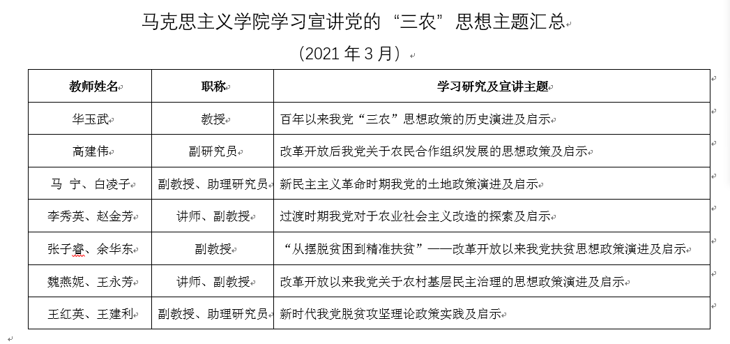 在党史学习教育中,威廉体育williamhill按照公司党委要求,结合公司办学特色和威廉体育williamhill实际,积极推动开展党的“三农”思想史学习研究和宣传工作。自3月10日公司依托“近现代史纲要”教研室教师、承担《习近平新时代中国特色社会主义思想概论》课的教师,正式组建党的“三农”思想史学习宣讲团以来,公司领导班子自成员带头、思政课教师党员积极参与,围绕百年来我党在土地改革、脱贫攻坚、乡村振兴、农业现代化、农村基层民主建设、农村合作组织建设等方面的思想和政策演进,精心选题、组团研究、扎实推进,在党史学习教育前期阶段认真开展党的“三农”思想学习、研究。