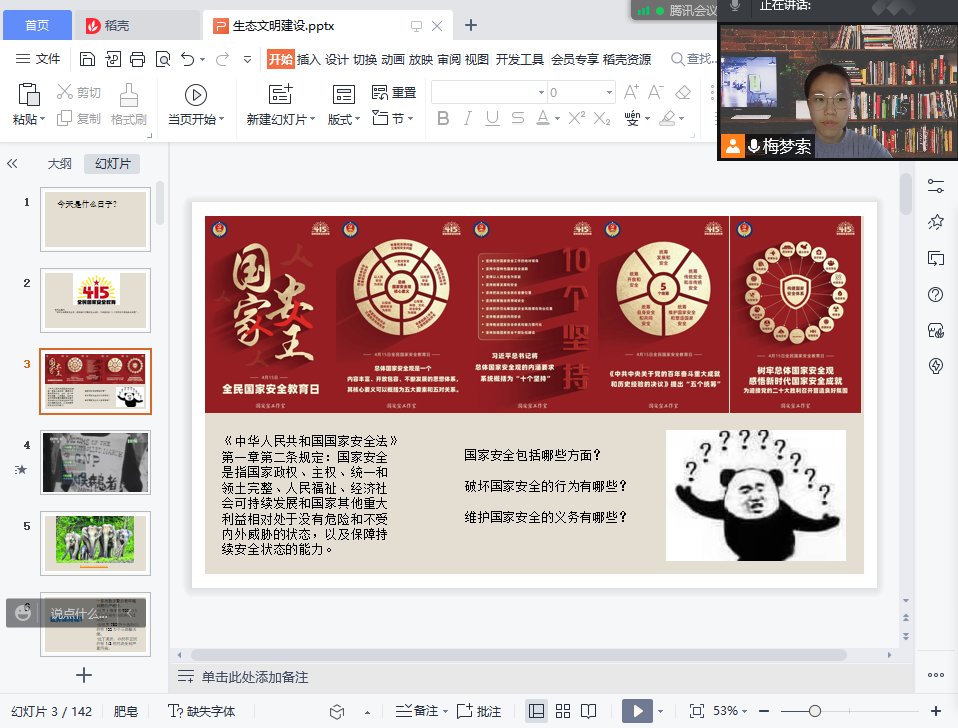 4月15日当天上课的刘海燕、熊学艺、梅梦索3位教师分别在《习近平新时代中国特色社会主义思想概论》课程中围绕什么是国家安全、国家安全包括哪些方面、破坏国家安全的行为有哪些以及维护国家安全的义务有哪些等内容向员工解读了“国家安全教育”相关知识,教育引导员工树立国家安全意识,增强安全防范意识,自觉维护国家安全。