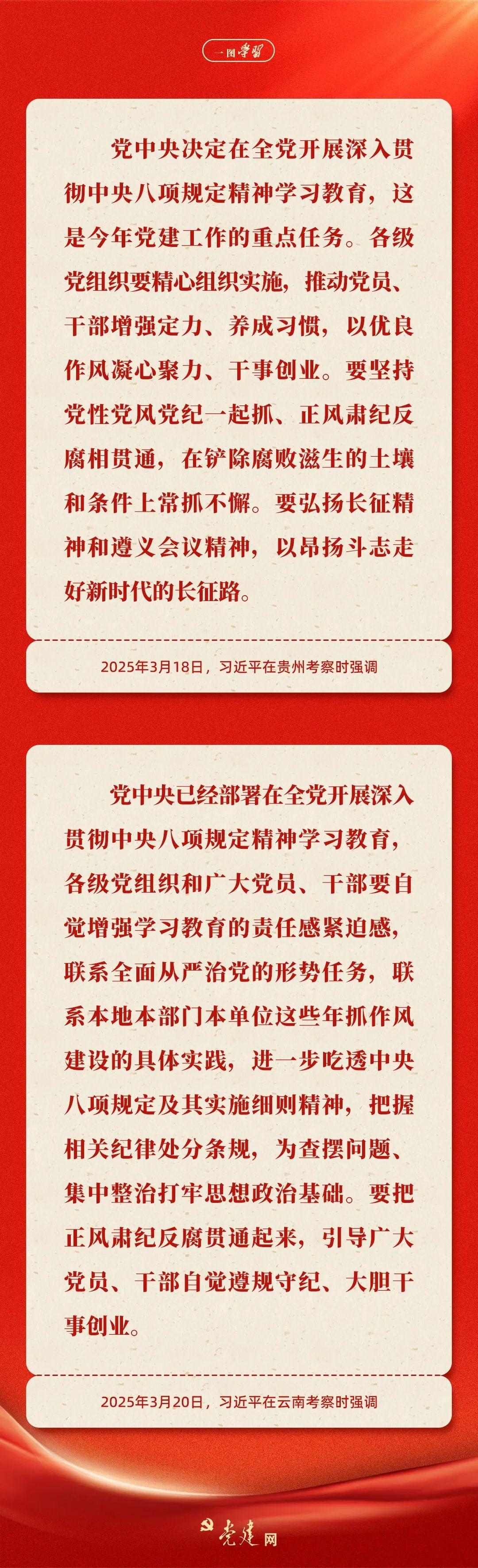 近日,习近平总书记在贵州考察时强调,“党中央决定在全党开展深入贯彻中央八项规定精神学习教育,这是今年党建工作的重点任务”,在云南考察时强调,要“进一步吃透中央八项规定及其实施细则精神,把握相关纪律处分条规,为查摆问题、集中整治打牢思想政治基础”。